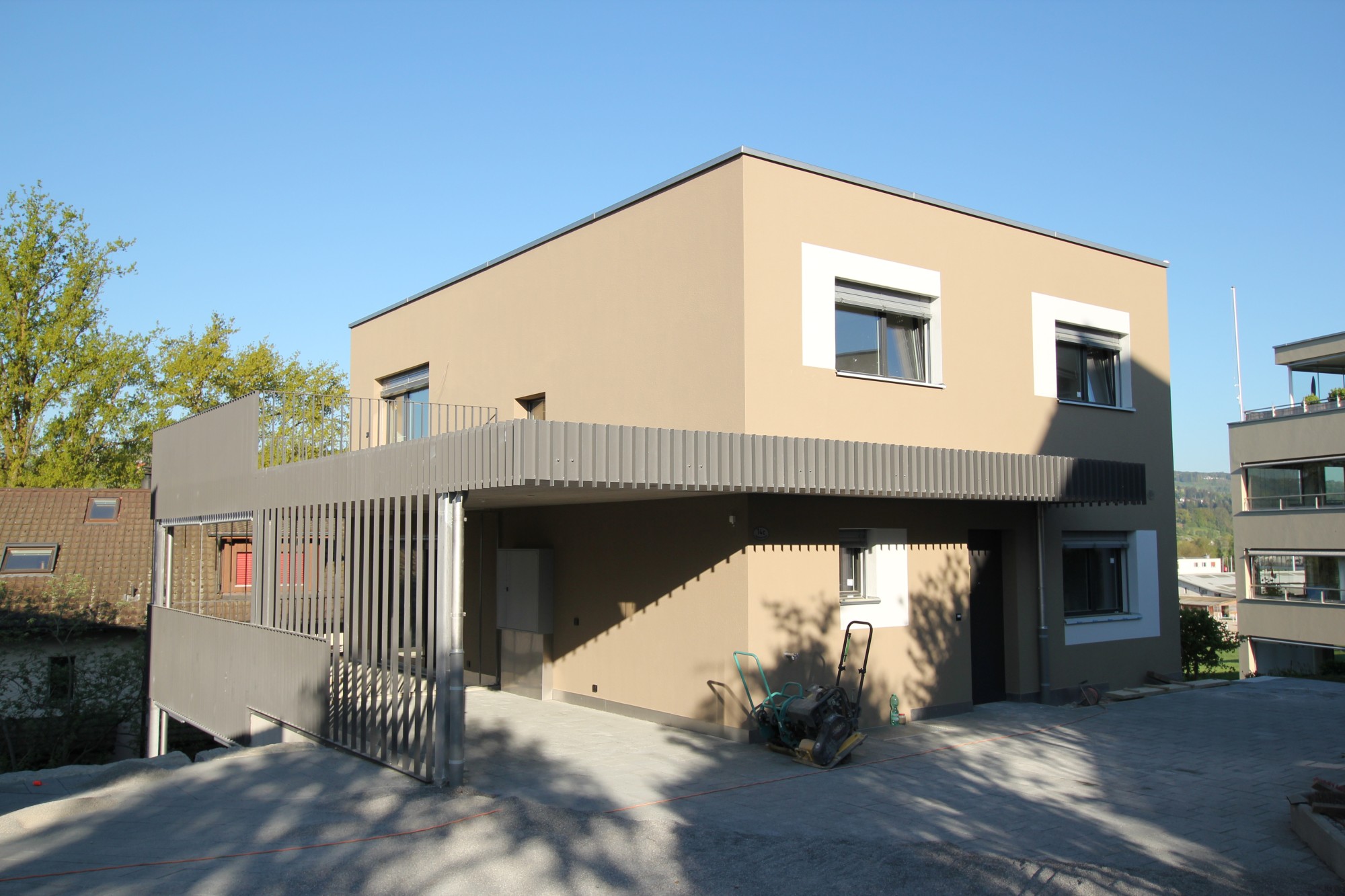 Balkon, Carport und Überdachung sind als feingegliederte Bauelemente aus Stahllamellen an den Gebäudehauptkörper angefügt.
