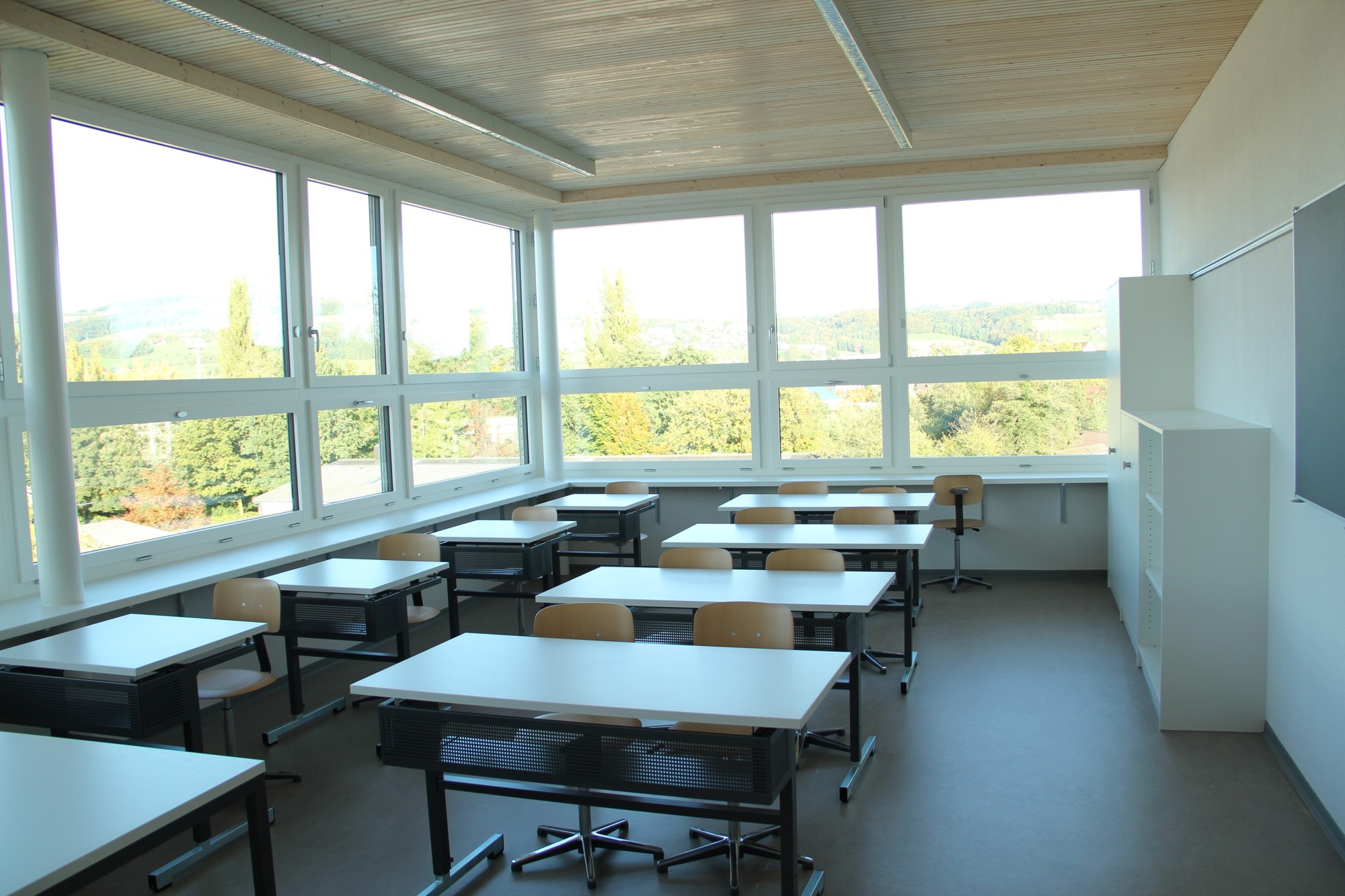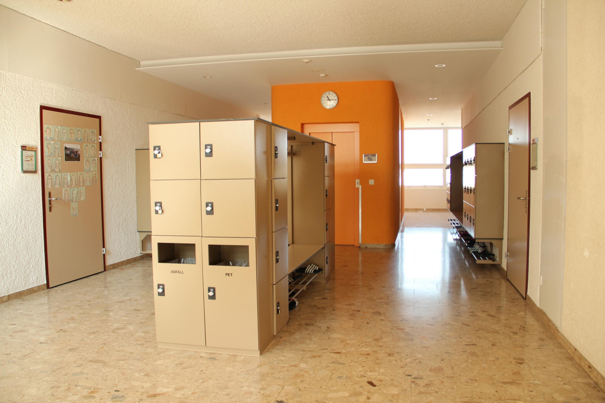 Die Gruppenräume sind als dreigeschossiger Anbau in Holz nordseitig an das bestehende Gebäude angefügt. Durch den Anbau werden zusätzliche Toilettenanlagen möglich.Ein neues Garderobenkonzept stellt genügend Ablageflächen für die Schüler sicher.