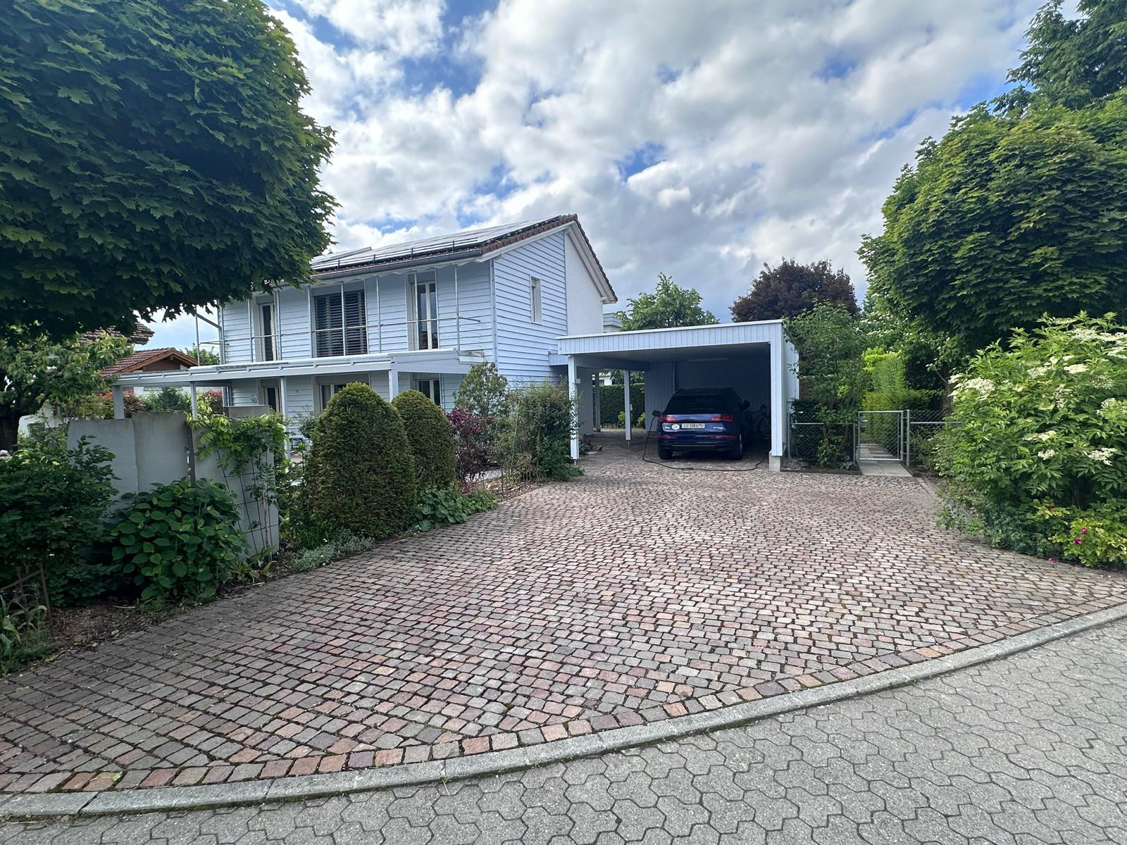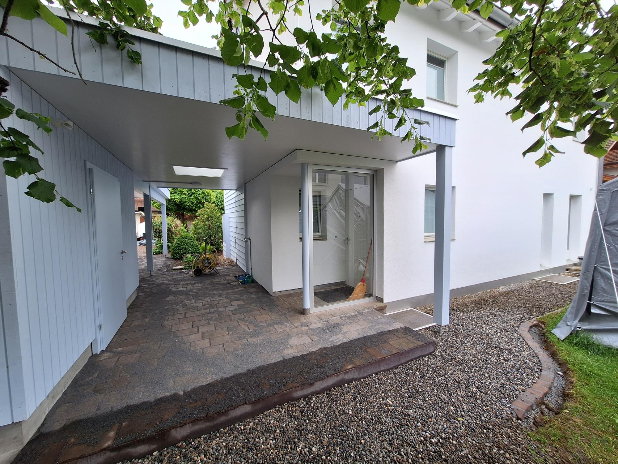 Das bestehende Einfamilienhaus wurde mit einem Carport in Holzbauweise ergänzt. Mit dem Carport konnte zudem ein neuer Abstellraum geschaffen werden, der nun für die Überwinterung der Pflanzen genügend Platz bietet. Eine neue Sitzplatzüberdachung in Glas ermöglicht einen geschützten Aufenthalt im Freien. Die Materialisierung und Farbgebung von Haus, Überdachung und Carport bilden eine einheitliches Gefüge.