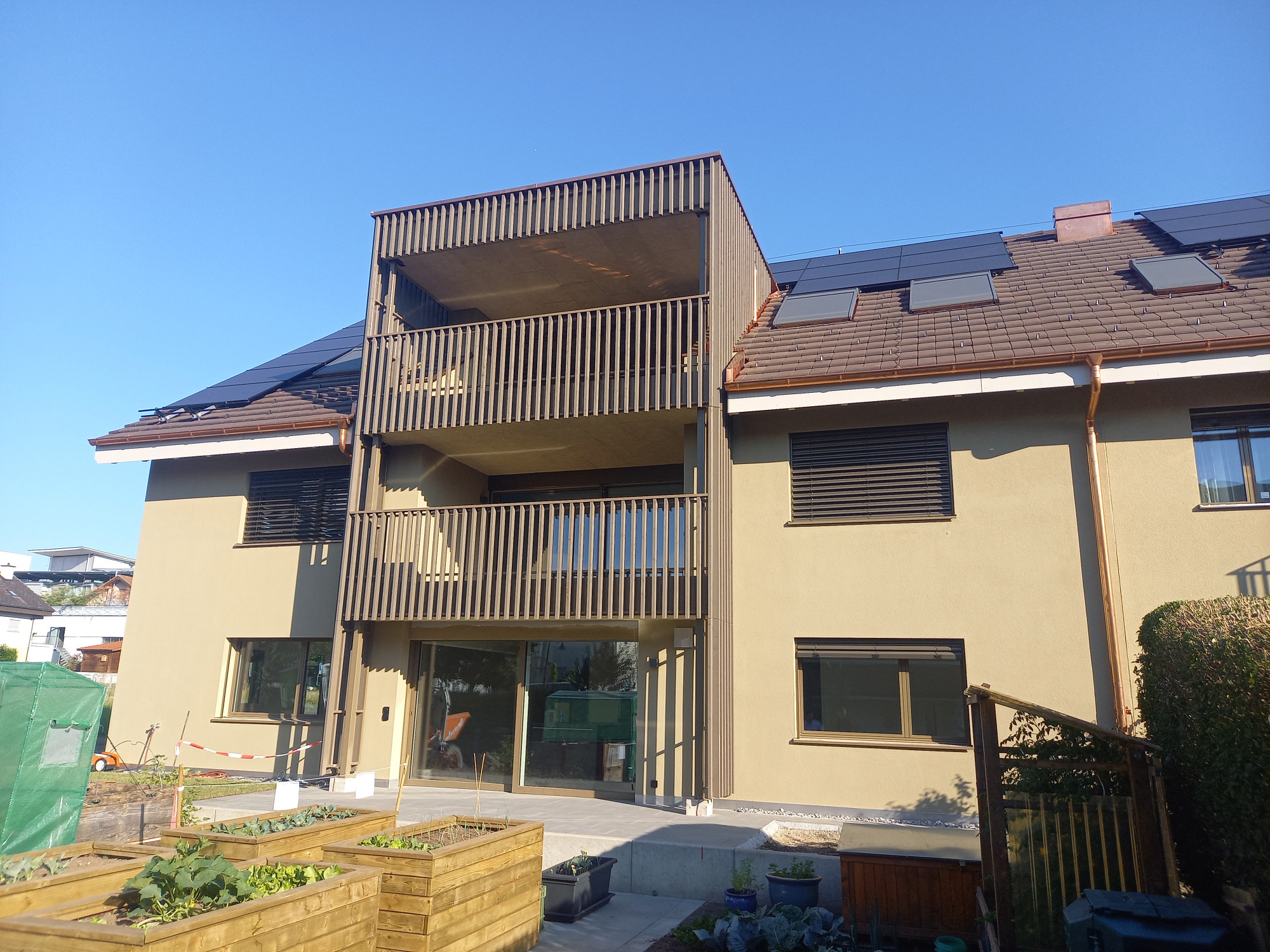 Die beiden Anbauten mit Lift und Balkone sowie ein neuer Carport sind ähnlich gestaltet: Vertikale Holzlamellen in dunkelbrauner Farbe fügen das Gebäude gestalterisch zu einer Einheit zusammen und verleihen Leichtigkeit.
