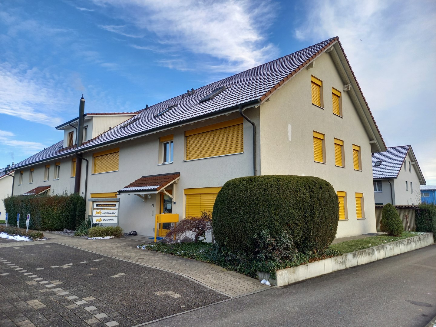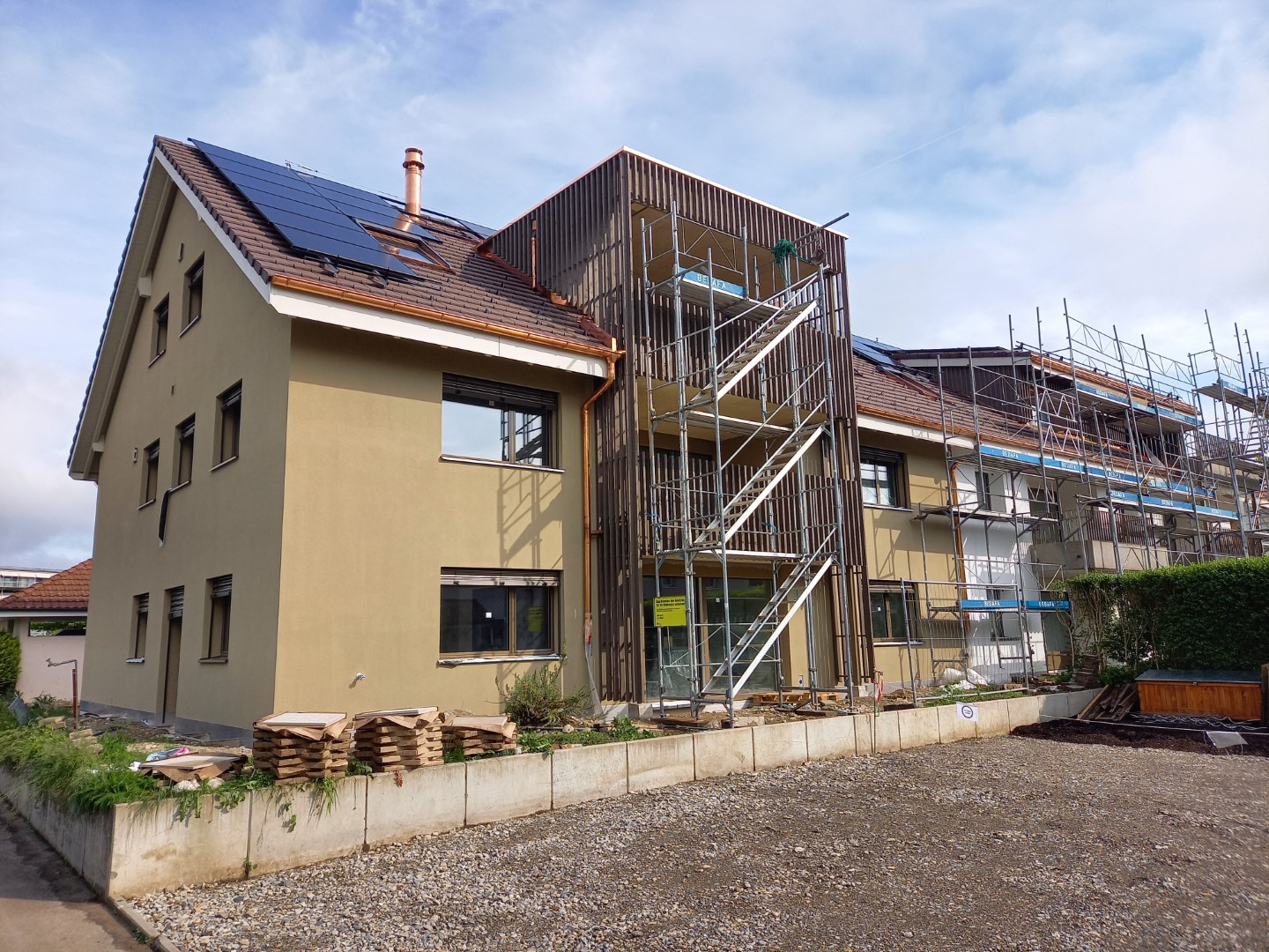 Das bestehende Bürogebäude wird in ein Wohnhaus mit 3 Eigentumswohnungen umgebaut. Zwei Anbauten mit Holzbekleidung erweitern das Gebäude mit Balkone und einem Lift. Zeitgleich erfolgt die energetische Sanierung des Nachbargebäudes und der Ersatz der bestehenden Ölheizung durch eine Wärmepumpe für das ganze Quartier.