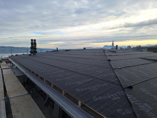 Über dem Ortszentrum von Nottwil, an erhöhter Hanglage, entsteht ein Zweifamilienhaus mit Seeblick. Das Gebäude organisiert sich über drei Geschosse. Beide Wohnungen verfügen über grosszügige Terrassen, Gartensitzplätze und je eine Doppelgarage. Ein flach geneigtes Walmdach in Blech, Erd- und Obergeschoss mit einer Holzverschalung und das Untergeschoss in Klinker gliedern das Gebäude horizontal.