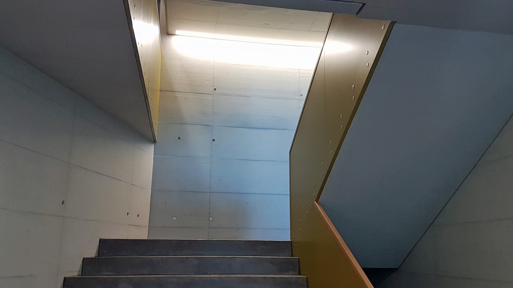 Drei in der Fassade frei angeordnete grüne Boxen und die spitzwinklige Gebäudeecke, setzen das Gebäude an der Durchfahrtsstrasse auffällig in Szene. Die spitzwinklige Geo-metrie wird im Treppenhaus weitergeführt.