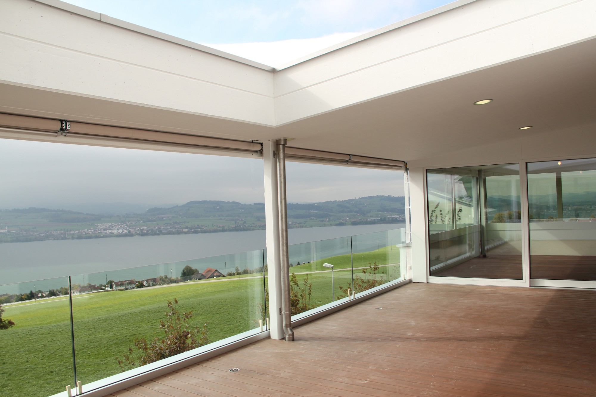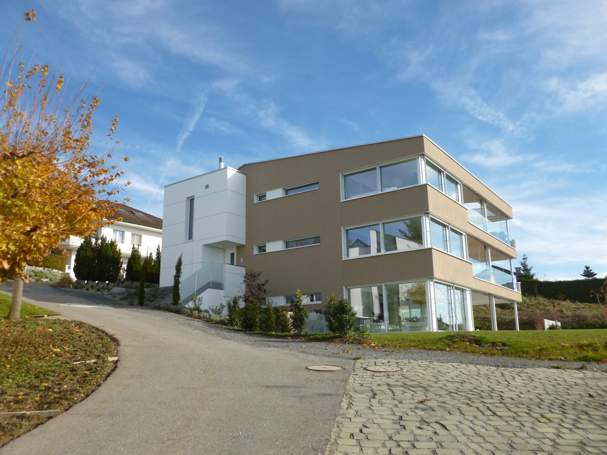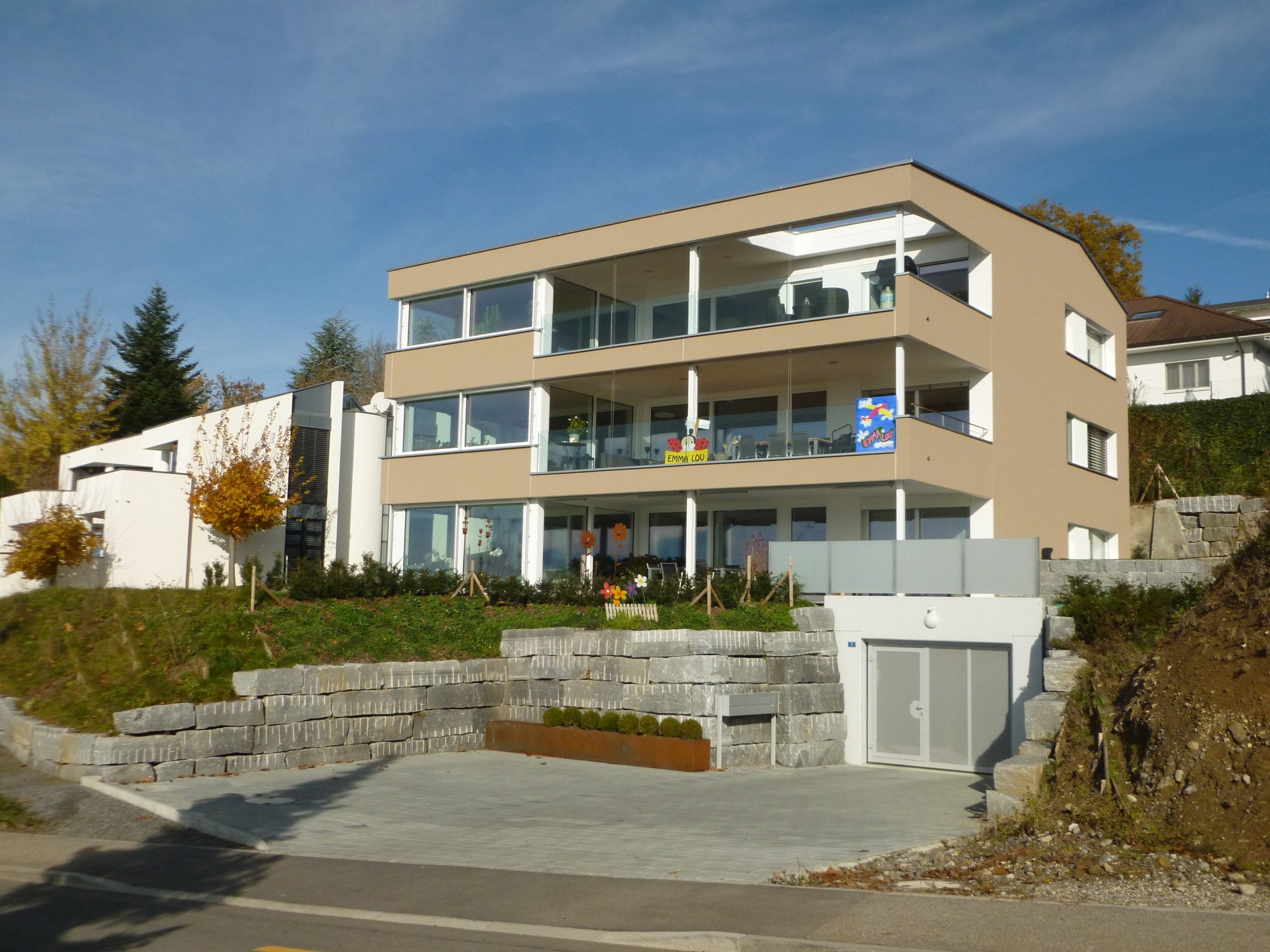 Es organisiert sich über drei Wohngeschosse, einem Unter-geschoss und einer Einstellhalle. Die drei grosszügigen 4 ½- Zimmerwohnungen sind modern ausgebaut und weisen hochwertige Materialien auf. Grosse und helle Räume tragen zum Wohlbefinden der Bewohner bei. Jede Wohnung verfügt über einen Wintergarten und eine grosszügige Terrasse, die sich über die ganze Gebäudelänge erstreckt. Das Haus ist behindertengerecht und im Minergiestandard gebaut.